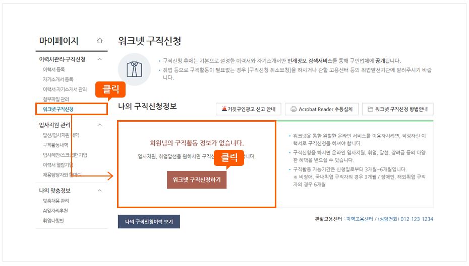 ▶ 워크넷 회원가입 후 로그인> 마이페이지> 이력서 등록> 자기소개서 등록> 구직신청하기> 구직신청 완료