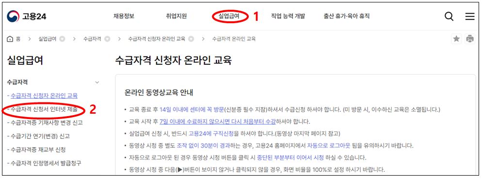 ▶고용24 홈페이지 로그인 > 실업급여> 수급자격> 수급자격 신청자 온라인 교육> 하단의 동영상 시청
