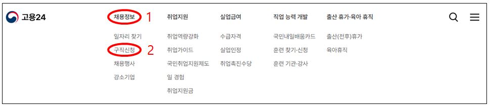 ▶ 고용24 회원가입 후 로그인 > 채용정보 > 구직신청> 이력서/자기소개서 등록> 구직신청하기> 구직신청 완료