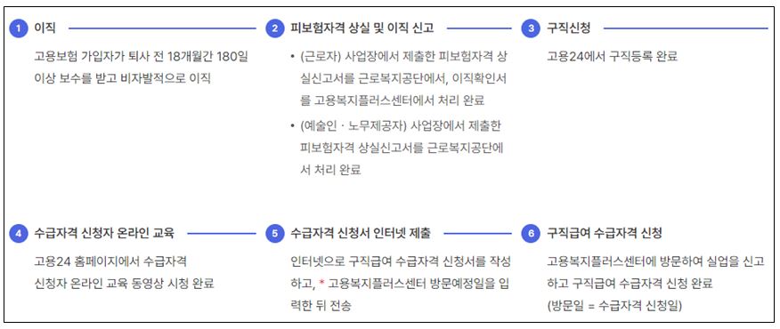 거주지 관할 고용센터 방문하여 실업을 신고하고 구직급여 수급자격 신청을 완료합니다. (방문일=수급자격 신청일)