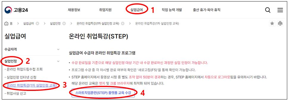 ① 실업급여> 실업인정> 온라인 취업특강> 스마트직업훈련(STEP) 플랫폼 교육 수강> 1차 실업인정일 교육 수강