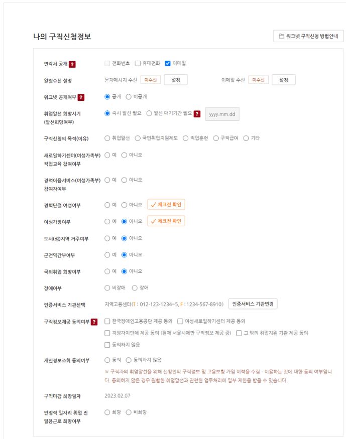 워크넷 구직신청 정보 입력화면에서 해당되는 조건들을 선택한 후 필요한 정보를 입력합니다.