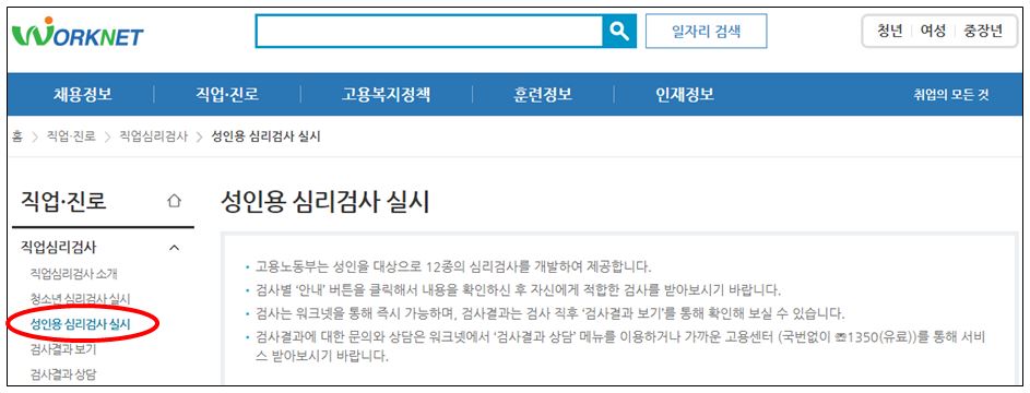 워크넷> 직업진로> 직업심리검사> 성인용 심리검사 실시(1개 제한)
