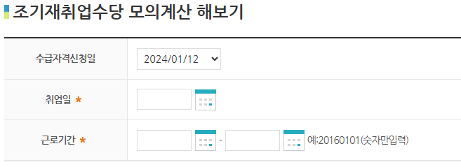 조기재취업수당 모의 계산은 사용자가 입력한 값(취업일 및 근로기간)을 토대로 계산되므로, 실제 대상여부 및 지급액과는 차이가 있을 수 있습니다.